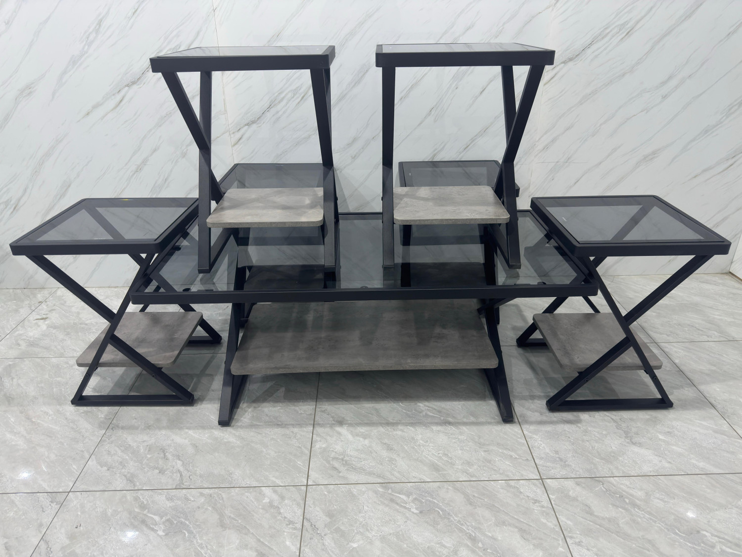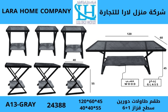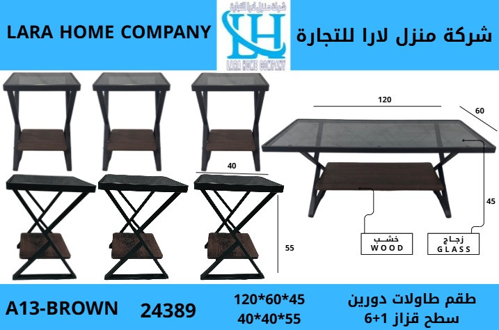 طقم طاولات 6+1 دورين بسطح زجاج رمادي وبني غامق وقواعد حديد