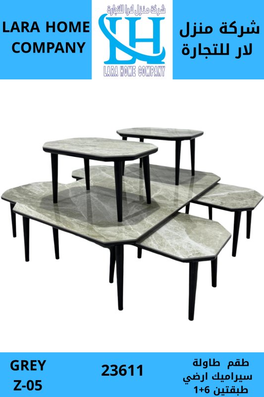 يتكون الطقم من 6 طاولات جانبية + 1 طاولة رئيسية مستطيلة الشكل، بسطح سيراميك فخم وقاعدة حديدية أنيقة.