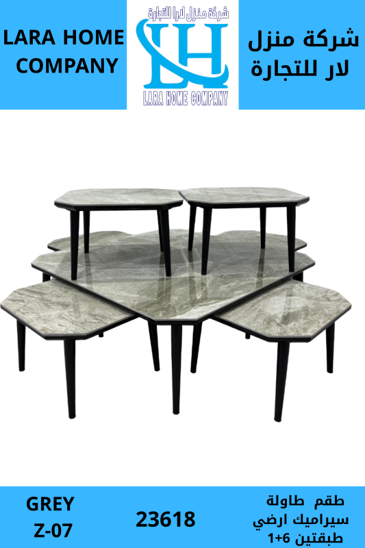 الطقم مكوّن من 6 طاولات جانبية صغيرة + 1 طاولة رئيسية بشكل مستطيل، بسطح سيراميك أنيق وقاعدة حديدية متينة.
